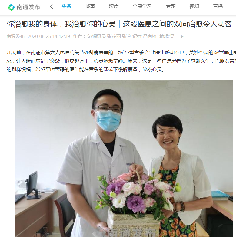 几天前,在南通市第六人民医院关节外科病房里的一场“小型音乐会”让医生感动不已,美妙空灵的旋律淌过耳朵,让人瞬间忘记了疲惫,似穿越万里,心灵澄澈宁静。原来,这是一名住院患者为了感谢医生,托朋友带来的别样祝福,希望平时劳碌的医生能在音乐的涤荡下缓解疲惫,放松心灵。