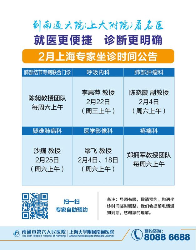 最新 | 南通六院2月门诊排班(含上海专家坐诊安排)