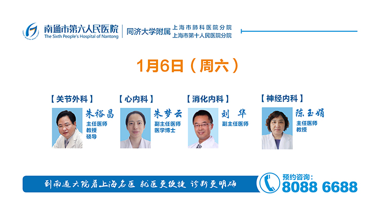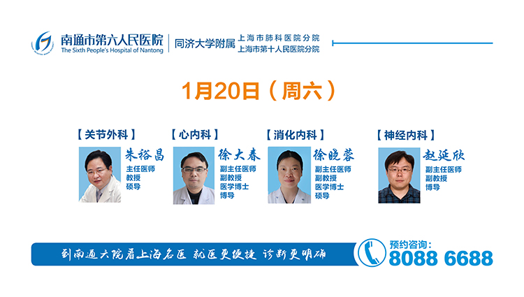 1月6日、20日上午上海市第十人民医院关节外科朱裕昌教授、心内科朱梦云,徐大春、消化内科刘华,徐晓蓉、神经内科陈玉娟,赵延新家坐诊六院 。