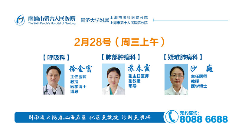 2月28日上午上海市肺科医院呼吸内科徐金富教授、肺部肿瘤科苏春霞专家、疑难肺病科沙巍教授坐诊六院 。