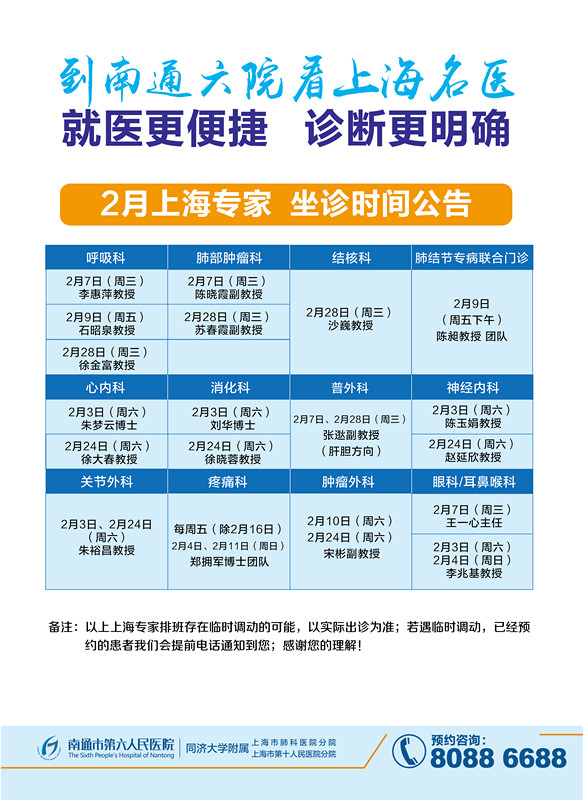 2018年2月份上海专家坐诊安排如下,